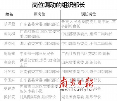 令人十分關(guān)注的是,已有三位省級(jí)組織部長(zhǎng)調(diào)任中央。其中,原廣東省委組織部長(zhǎng)胡澤君任最高人民檢察院黨組副書(shū)記、常務(wù)副檢察長(zhǎng);原廣西自治區(qū)組織部長(zhǎng)陳向群任中組部部務(wù)委員、組織二局局長(zhǎng);原湖北省委組織部長(zhǎng)潘立剛?cè)沃薪M部部務(wù)委員、干部二局局長(zhǎng)。據(jù)公開(kāi)的資料顯示,此三人在擔(dān)任地方組織部長(zhǎng)前,均有在中央部委的工作經(jīng)歷。