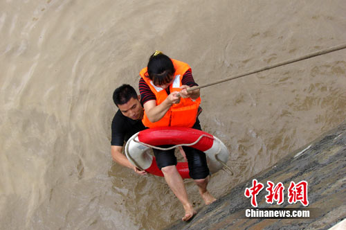 消防官兵搜尋到中攤堡大道,聽到中普建設楓香樹村安置房與中攤堡安置房交界處傳來求救聲音,利用強光手電筒發(fā)現(xiàn):洪水已將4名來不及疏散的施工人員團團包圍,工人在樓頂揮手、呼喊求救!安灰,我們馬上想辦法過來救你們”。由于水流很急且到處都是施工隊挖的暗溝,時間緊迫,消防站余柯政站長來不及多考慮,立即下令,將保險繩拴在消防車上,余站長和劉飛穿上救生衣,綁好安全繩后,帶著救生圈慢慢的游到被困群眾位置,將救生衣為民工穿好后,一邊由消防官兵護送一邊由在消防車一邊的其余消防官兵牽引安全繩接應,緊急轉移被困群眾。一趟、兩趟、三趟……經(jīng)過近半小時的奮戰(zhàn),成功救出被困工人。