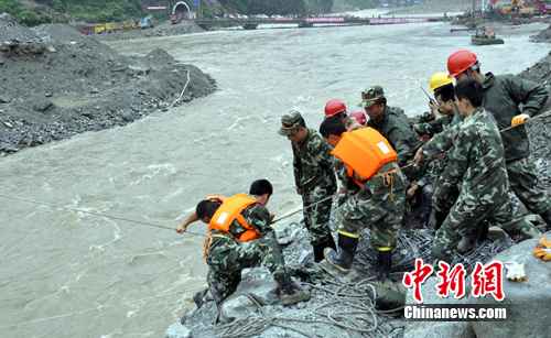 中新網(wǎng)映秀8月18日電(郭永全 張浪 鄢銀嬋)18日早6點,汶川消防大隊映秀消防站接到武警水電部隊求助電話,在位于映秀鎮(zhèn)堰塞湖處處理淤泥沙石拓寬河道的數(shù)十名機械工人因河道加寬,水流湍急,無法從原來搭設的繩橋往返對岸進行作業(yè)。