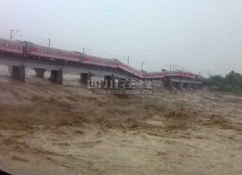 據(jù)廣漢市政府電話報(bào)告,鐵路寶成線跨石亭江大橋(廣漢小漢境內(nèi))沖毀兩個橋墩三孔,西安至昆明客運(yùn)車懸掛橋上,廣漢市已積極組織力量正在進(jìn)行搶險(xiǎn)和轉(zhuǎn)移旅客。
