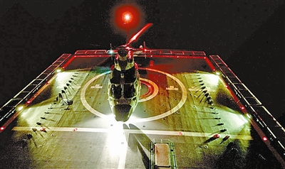 8月11日,南海某海域夜幕降臨,茫茫大海上,一架直升機(jī)向正在破浪行駛的某新型導(dǎo)彈驅(qū)逐艦飛近,平穩(wěn)地降落在甲板上。南海艦隊(duì)航空兵某飛行團(tuán)某型艦載直升機(jī)成功進(jìn)行夜間著艦訓(xùn)練。