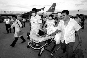 昨日,上述兩家醫(yī)院的4名醫(yī)生與4名護士,組成醫(yī)療隊,攜帶轉(zhuǎn)運途中可能需要的醫(yī)療器械和藥品,于上午11時40分從首都機場出發(fā)飛赴伊春,接收10名傷員來京繼續(xù)治療。