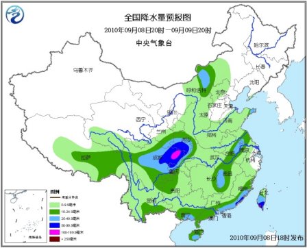 8日20時至9日20時,西藏中東部、青海南部、甘肅南部、寧夏南部、陜西、內(nèi)蒙古中部、華北大部、黃淮、江淮、江漢、江南大部、華南以及西南地區(qū)等地有小到中雨或陣雨,其中,四川盆地、川西高原中部、甘肅東南部、陜西南部、重慶西部和北部、福建東南部沿海、廣東中東部沿海、臺灣中南部等地有大雨或暴雨,四川盆地東北部局地有大暴雨;內(nèi)蒙古中部、山東半島東部、蘇皖中部、江西西部、廣西東南部、海南南部等地的部分地區(qū)有大雨;上述局部地區(qū)并伴有短時雷雨大風或冰雹等強對流天氣。新疆北部、甘肅西部、內(nèi)蒙古中西部和東南部等地有4~6級風。受10號熱帶風暴影響,臺灣海峽、臺灣以東洋面和以南海域、南海東北部有7~9級大風,風暴中心經(jīng)過的附近海域風力有10級,陣風11~12級;東海南部有5~7級東南風。黃海中北部有5~6級旋轉(zhuǎn)風;南海中部有5~6級西南風。