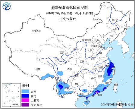 中新網(wǎng)9月10日電 據(jù)中央氣象臺網(wǎng)站消息,中央氣象臺9月10日18時發(fā)布暴雨藍色預(yù)警:9月10日20時到11日20時,江蘇東部和南部、上海、安徽東南部、浙江大部、江西東北部和東南部、福建西北部和南部、廣東大部、廣西南部、海南中北部、云南大部、川西高原南部、西藏東南部等地有大雨或暴雨,局地有大暴雨;上述地區(qū)局部并伴有短時雷雨大風等強對流天氣。