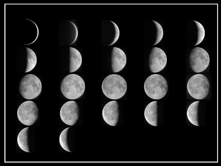 月球位于日、地之間時(shí)叫做“朔”,月球暗的半個(gè)球朝向地球,我們看不到它。朔之后的一兩天,鐮刀狀的新月在傍晚西方的天空中露面,凸面向著落日的方向。以后月球相對(duì)于太陽逐漸向東移動(dòng),亮的部分日益擴(kuò)展。五六天以后成了半圓形,這時(shí)的月相稱為“上弦”,日落時(shí)月球在天子午線附近。再經(jīng)過7天,便到了“望”(滿月),月球與太陽遙遙相望,我們看到的是一輪明月于傍晚東升,在晨曦中西落,將黑夜照耀得如同白晝一般。滿月以后,圓輪的西部日益虧缺。到“下弦”時(shí),呈半圓形,月球到半夜才升起。和上弦月相反,下弦月是東邊半個(gè)圓被照亮。下弦以后,半圓繼續(xù)虧缺,成為黎明前掛在東方天空的一絲殘?jiān)隆K鷣碛咏,終于跑到和太陽相同的方向,朔又來臨了。