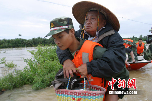 13時(shí)許,萬(wàn)寧市萬(wàn)城鎮(zhèn)紅關(guān)村暴雨持續(xù)不斷,1000余名村民需緊急轉(zhuǎn)移撤離。武警三亞市支隊(duì)奉命派出120名官兵,攜帶救生衣、雨衣等搶險(xiǎn)物資驅(qū)車趕往紅關(guān)村疏散轉(zhuǎn)移被困村民。由于村民躲在家里不愿上救生艇,官兵們一邊耐心說(shuō)服、勸導(dǎo),一邊協(xié)同地方領(lǐng)導(dǎo)組織村民向安全地帶轉(zhuǎn)移。經(jīng)過(guò)將近6個(gè)小時(shí)的緊急撤離,所有被困村民安全轉(zhuǎn)移到安全地帶。