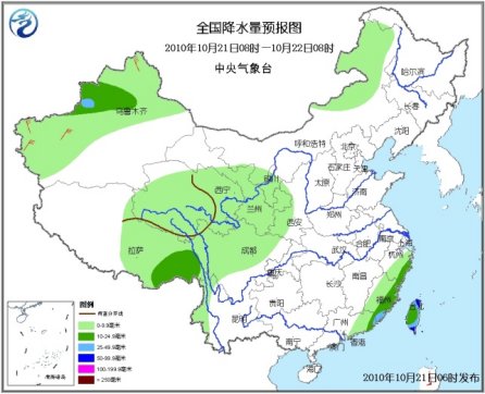 21日08時(shí)至22日08時(shí),新疆北部和西部、西藏東部、青海大部、川西高原中北部、內(nèi)蒙古東北部等地有小雨(雪)或雨夾雪;甘肅中東部、寧夏中南部、陜西西南部、四川盆地西北部、云南西北部、浙江東南部、福建大部、廣東東部、臺(tái)灣等地有小到中雨或陣雨,其中,福建東南部、臺(tái)灣等地有大雨,局地有暴雨;上述局部地區(qū)并伴有短時(shí)雷雨大風(fēng)等強(qiáng)對(duì)流天氣。新疆北部、東南部沿海等地有4~6級(jí)風(fēng),新疆西北部山口地區(qū)風(fēng)力可達(dá)8~9級(jí)。南海東北部海域的風(fēng)力將有10~13級(jí)、陣風(fēng)可達(dá)14~15級(jí);“鲇魚(yú)”中心經(jīng)過(guò)的附近海域的風(fēng)力將有14~16級(jí)、陣風(fēng)可達(dá)17級(jí)及以上;東海大部、臺(tái)灣海峽、南海西北部將有7~9級(jí)大風(fēng)。