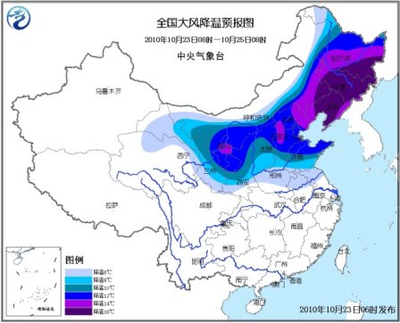 根據(jù)這份寒潮藍色預警,預計,10月23日08時至25日08時,內蒙古大部、東北、甘肅大部、西北地區(qū)東部、華北、黃淮、江淮北部等地將出現(xiàn)6~12℃降溫,其中,寧夏中部、河北西部和東北部、內蒙古東南部、東北大部等地的部分地區(qū)降溫幅度可達14~16℃;上述大部地區(qū)有4~6級偏北風。