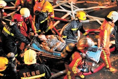 由于火災(zāi)撲救時(shí)間較長,一些消防救援人員也已經(jīng)體力不支。記者看到,一名消防人員險(xiǎn)些昏倒在現(xiàn)場,旁邊的120救援人員和民警立即趕上,扯開他的衣服,并立即對他展開急救。另一名消防人員由于不堪大火高溫的炙烤,他的頭盔里裹著一條濕毛巾,而他依然背著一名已經(jīng)昏迷的被困市民踉踉蹌蹌地跑出火災(zāi)現(xiàn)場。旁邊的同事見狀立即上前扶住被困市民,這名消防人員隨即跌坐在了積水的地面上。