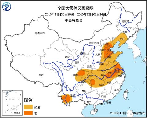 中央氣象臺11月30日18時(shí)發(fā)布大霧藍(lán)色預(yù)警: