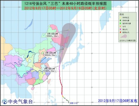 今年第16號超強臺風(fēng)“三巴”于昨日(16日)20時減弱為強臺風(fēng),今晨5時,中心附近最大風(fēng)力有14級(45米/秒),中心最低氣壓為948百帕。預(yù)計“三巴”將于17日中午前后登陸,登陸地點鎖定在韓國南部一帶沿海,強度逐漸減弱。受“三巴”影響,東北地區(qū)中東部將有中到大雨,部分地區(qū)有暴雨。