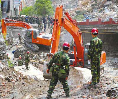 5月15日,記者看到,中國人民解放軍第二炮兵及北京路橋、四川路橋和華西集團的挖掘機、推土機等重型施工機械經(jīng)過長途開進,突入北川,立即投入,晝夜不停。四臺挖掘機在探照燈照射下,緊張施工,機械手輪流操作,機器徹夜不停轉(zhuǎn)。