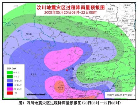 20-21日,震中及其附近地區(qū)將有一次中雨過程,四川汶川、北川、理縣、茂縣、綿竹等重災(zāi)區(qū)的降雨量有8-22毫米,四川松潘、黑水、馬爾康以及甘肅文縣降雨量可達(dá)25-40毫米(圖1),并伴有短時雷電、雷雨大風(fēng)等強(qiáng)對流天氣。22日,震區(qū)還將有2-8毫米的降雨(圖2)。需注意局地強(qiáng)降雨給抗震救災(zāi)工作帶來的不利影響。