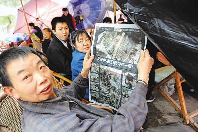 綿陽安縣人民公園安置點,為災(zāi)區(qū)群眾提供了最新的報紙。(王科/攝)