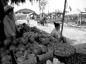 鎮(zhèn)政府前的馬路兩邊,搭滿安置受災(zāi)群眾的帳篷。有幾個帳篷前支起西瓜攤兒,顧客并不多,攤主們聊著天。