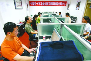 王汝鵬用“井噴式的捐款”來形容這次的捐款狀態(tài)。他說,常態(tài)時(shí),紅基會(huì)平均每天接受幾十或上百筆捐款。而地震發(fā)生后,每天捐款數(shù)額激增到五六萬筆。”