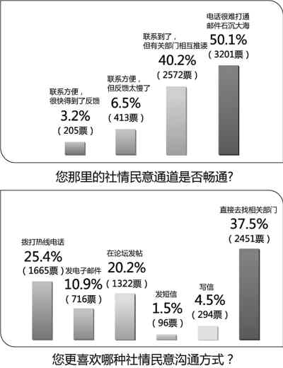 在通訊方式日新月異的今天,網(wǎng)友更喜歡哪種社情民意溝通方式?調(diào)查顯示,如果有問(wèn)題向政府咨詢或者投訴,直接去找相關(guān)部門(mén)仍是網(wǎng)友的首選,37.5%的人選擇了這種方式。而選擇撥打熱線電話的網(wǎng)友超過(guò)25%,選擇發(fā)電子郵件、在論壇發(fā)帖、發(fā)短信等新興通訊方式的超過(guò)30%,只有4.5%的網(wǎng)友選擇傳統(tǒng)的書(shū)信聯(lián)系方式。(記者紀(jì)雅林)