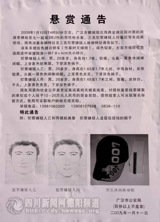 13日上午,記者在廣漢各大街道、小區(qū)看到,廣漢市公安局貼出了懸賞通告,向社會公開懸賞征集廣漢市“1.10”惡性槍殺案相關(guān)破案線索,對提供重要線索的單位或者個(gè)人,將給予10-20萬人民幣現(xiàn)金獎勵。提供線索人可以匿名舉報(bào)方式。舉報(bào)電話:13981062260、13908107528、0838-110(記者 李安國)