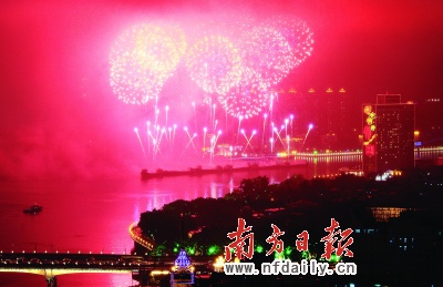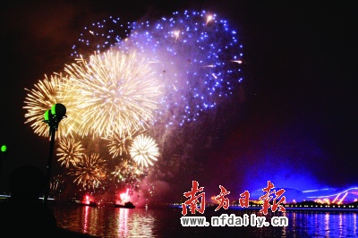 今年燃放的煙花新穎別致。許多曾在北京奧運(yùn)會開閉幕式上令世界驚艷的煙花表演品種昨日在廣州匯聚一堂,貫穿整個(gè)晚會。