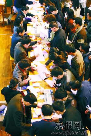 今天上午,節(jié)后首場綜合招聘會(huì)在(北京)農(nóng)展館舉行,人潮涌動(dòng)的熱烈場面再次凸顯了2009年嚴(yán)峻的就業(yè)形勢。再過幾天,北京市及中央國家機(jī)關(guān)公務(wù)員招考也將陸續(xù)進(jìn)入面試階段。