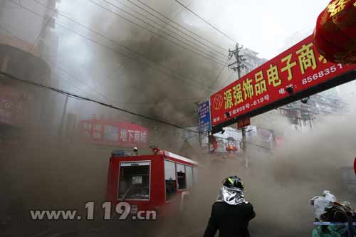當(dāng)日上午9時(shí)51分,武漢市119指揮中心接到火災(zāi)報(bào)警后,立即調(diào)集21個(gè)消防中隊(duì)、79臺(tái)消防車、322名消防官兵趕赴現(xiàn)場(chǎng)進(jìn)行撲救。發(fā)生火災(zāi)的華貿(mào)商城為一幢9層商住樓,一樓為經(jīng)營(yíng)門面、2樓和3樓為倉(cāng)庫(kù),4樓以上為居民住宅。