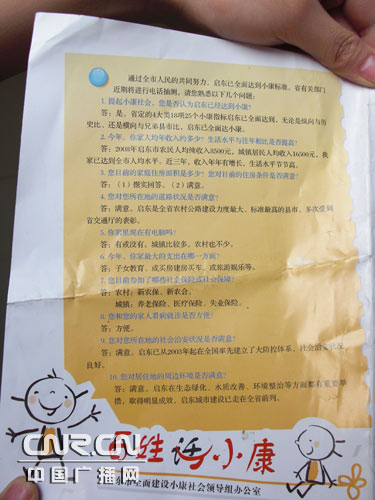 在多位村民家中,記者都看到了由啟東市全面建設(shè)小康社會領(lǐng)導(dǎo)小組辦公室印發(fā)的電話調(diào)查問卷。在這份印刷精美的問卷中共列有十個問題,并給出了標準答案。無論實際家庭人均年收入多少,農(nóng)村居民必須回答8500元,城鎮(zhèn)居民必須回答16500元。無論是否參加社會保險或保障,都必須回答參加了;無論對住房、道路、居住環(huán)境是否滿意,都必須回答滿意。
