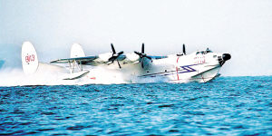 這是一架外形奇特的飛機(jī):機(jī)翼兩側(cè)各垂有一個(gè)巨大的橄欖球狀物,機(jī)腹是傾斜的切割面形狀,好似巨輪的船身?吹接浾咭荒樢苫螅蛋囝I(lǐng)導(dǎo)、政委張汝翼為記者指點(diǎn)迷津:“這就是我們部隊(duì)號稱‘海天鯤鵬’的水上飛機(jī),是全軍僅有的一種特殊機(jī)種,不僅能航行在遼闊的江河湖海,還能馳騁在藍(lán)天之上,機(jī)翼兩側(cè)配有保持浮力和平衡的‘浮筒’……”