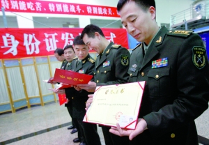 海淀分局人口處民警介紹,去年4月開(kāi)始,經(jīng)國(guó)務(wù)院、中央軍事委員會(huì)同意,在全國(guó)范圍內(nèi)為現(xiàn)役軍人和武警部隊(duì)官兵發(fā)放軍人身份證,北京作為試點(diǎn)單位自去年6月先期為駐京部隊(duì)發(fā)放。軍人、武警官兵在社會(huì)活動(dòng)中,如買房、買車、貸款等都可持居民身份證辦理。(記者田北北)