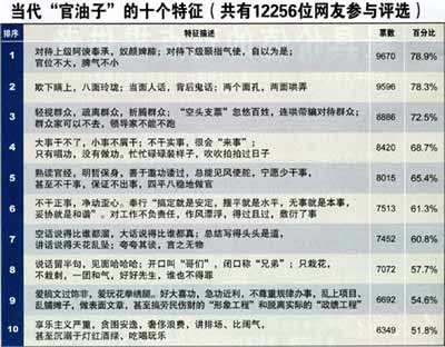 第三個階段:網(wǎng)絡調(diào)查。自2009年2月1日—2月12日,“官油子具備哪些特征”的專題調(diào)查(分為18條“官油子”特征評選和公眾對“官油子”的態(tài)度調(diào)查兩個部分)在人民網(wǎng)、新浪網(wǎng)、騰訊網(wǎng)、人民論壇網(wǎng)等網(wǎng)絡上推出。為什么選擇這幾家網(wǎng)站?因各網(wǎng)站的主要受眾群體不同,如人民網(wǎng)主要面向黨政干部,新浪網(wǎng)、騰訊網(wǎng)等為商業(yè)性網(wǎng)站,受眾面更廣,如此能夠體現(xiàn)更加廣泛地參與性,以使調(diào)查更具代表性。網(wǎng)絡調(diào)查推出短短十幾天的時間,即受到了廣大網(wǎng)友的熱情參與,共有12256人參與。在廣大網(wǎng)友的共同參與下,我們按照得票數(shù)的多少,列出了“官油子”的十種特征。