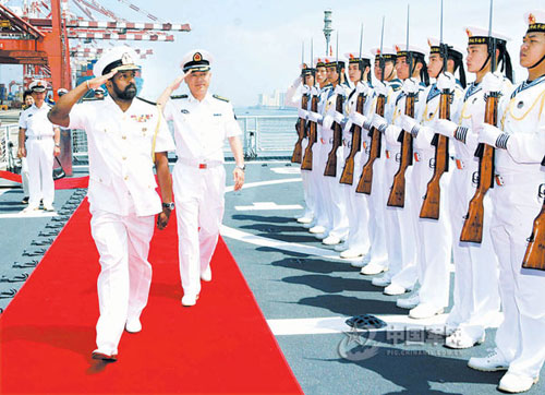 “廣州”艦停靠科倫坡港期間,中國(guó)駐斯里蘭卡大使楊秀萍及部分使館工作人員專門登艦看望并慰問來自祖國(guó)的海軍官兵。斯里蘭卡海軍西部海區(qū)司令克倫貝濟(jì)少將也登上“廣州”艦,對(duì)中國(guó)海軍的到來表示歡迎,并與中國(guó)海軍官兵進(jìn)行了友好交流。在楊秀萍大使、陳岳琪指揮員的陪同下,克倫貝濟(jì)將軍饒有興致地參觀了“廣州”艦;谒估锾m卡首都科倫坡目前社會(huì)形勢(shì)不穩(wěn)定,斯里蘭卡政府今天專門增派兵力,加強(qiáng)了對(duì)科倫坡港的警戒。