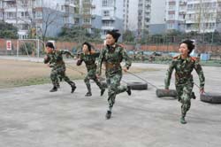 在女子特警隊(duì)營區(qū),一隊(duì)新入伍的女戰(zhàn)士正在訓(xùn)練。據(jù)陪同我們的隊(duì)長王安斌介紹,特警隊(duì)擔(dān)負(fù)著四川總隊(duì)每年的女兵新訓(xùn)任務(wù),女特警隊(duì)員就是從這里層層選拔出來的。每年新兵訓(xùn)練結(jié)束時,特警隊(duì)通過組織對全體新戰(zhàn)士進(jìn)行政治思想摸底,文化水平、心理素質(zhì)測試及軍事體育、擒敵技術(shù)、戰(zhàn)術(shù)等科目綜合考核,按照層層選拔、優(yōu)中選優(yōu)的原則,遴選出軍事過硬、素質(zhì)全面的新同志補(bǔ)充到女子特警隊(duì)。作為一名女子特警隊(duì)員,她們?nèi)腙?duì)后還必須在心理上、生理上承受常人難以想象的磨礪,經(jīng)過特種戰(zhàn)術(shù)、攀登、射擊、擒敵等20多個科目的訓(xùn)練,過好體能關(guān)、心理素質(zhì)關(guān)、特戰(zhàn)技能關(guān),才能真正實(shí)現(xiàn)脫胎換骨的轉(zhuǎn)變,成為一位名符其實(shí)的特戰(zhàn)隊(duì)員,而這一切都是依靠特殊的訓(xùn)練來實(shí)現(xiàn)的。