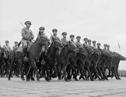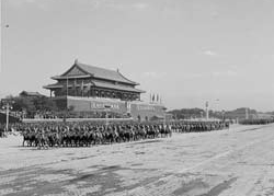 阿木古楞:受閱壓力很大,覺得在天安門接受毛主席檢閱,比打錦州沖鋒陷陣還緊張啊。記得閱兵總指揮楊成武在會上對各部隊(duì)指揮員說,誰的馬驚了,就撤團(tuán)長的職。我們真擔(dān)心出岔子啊。部隊(duì)訓(xùn)練很刻苦,士兵很下功夫。在北京駐訓(xùn)時正是炎夏,北京熱呀。我們騎兵常年駐在草原,涼快慣了,熱得人和馬都受不了。我們每天早上4時起床,5時就開始訓(xùn)練,練到10時才休息,下午接著練,一直練到黃昏。特別是馬不好練。我們的馬都是從戰(zhàn)場上下來的,打仗可以,騎手雙腿一夾,馬撒腿就往上沖,現(xiàn)在不行,必須步伐整齊。要踩著音樂,跟上拍子。