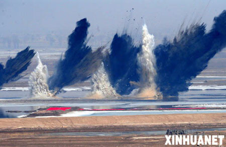 記者看到,這個(gè)河段的主河道還被厚冰覆蓋著,大堤外已經(jīng)鋪起一個(gè)大大的紅色T字形參照物,這是為飛機(jī)投彈指示方位的。11時(shí)25分左右,3架銀色轟炸機(jī)穿過(guò)云層,飛抵黃河上空,進(jìn)入投彈區(qū)域。