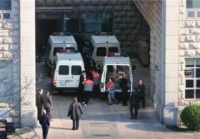 昨天上午8點(diǎn),由4輛囚車組成的車隊(duì)呼嘯而至市二中院,進(jìn)門(mén)后徑直開(kāi)到了審判大樓的后面。囚車停穩(wěn)后,趙鵬運(yùn)等28名被告人被逐一帶入暫看室。記者看到,法院院里停了兩輛120急救車,院外,有近20輛警車分布在法院周圍,大批警力在現(xiàn)場(chǎng)維持秩序。