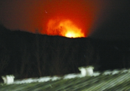 昨晚7時30分,就在人們都以為大火已被撲滅時,山南側突然冒出一道火光,隨之升起的煙霧也被火光映成了紅色。大約兩分鐘后,火光漸漸消失。山上只剩下零星的手電筒的“光點”。