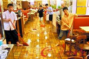 短時間的強降雨導(dǎo)致沙河金馬服裝城一樓檔主遭殃,數(shù)十家檔口被淹。檔主李小姐說:“衣服全部濕了,損失幾萬元呢!弊尷钚〗悴粷M的是,平常一樓鋪租就很貴,每個月至少5000元,但水浸后,管理人員卻沒有馬上處理。
