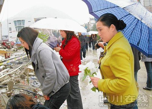 北川禹里鄉(xiāng)的劉福群、鄭福軍姐弟倆,在涼風(fēng)埡按規(guī)定下車后,交警指引他們免費搭乘專線車到任家坪。姐弟倆來到北川中學(xué),在廢墟前為他們遇難的孩子點燃祭奠的香火。