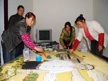 據(jù)介紹,整幅圖畫高一點八三米,寬三點零五米,以木板為底,畫面色彩搭配全部用當?shù)厥a(chǎn)的玉米、黃豆、小豆、黑豆、蕎麥等二十多種雜糧拼貼。畫面內(nèi)容以山水環(huán)繞的棗樹村為背景,溫家寶總理居中,左右分別是棗樹村抗震救災英雄石光華等村民。