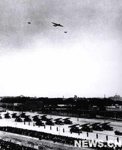 當?shù)孛娌筷牻?jīng)過廣場時,在天空出現(xiàn)了英勇的鐵鷹,兩架殲擊機護送著一架領航機飛在前1954面,接著重轟炸機、噴氣式轟炸機和殲擊機,一隊一隊地掠過天安門上空。