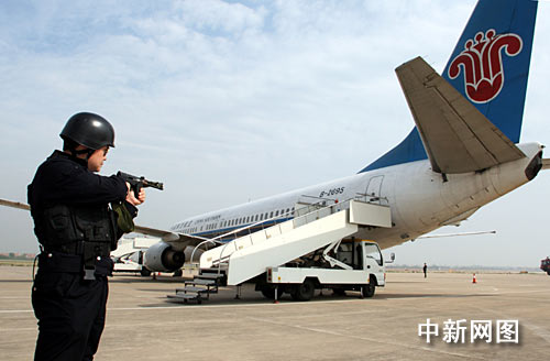 中新網(wǎng)武漢4月28日電 (林樺 陳曉東 田劍清 徐金波)一場(chǎng)驚心動(dòng)魄的反劫機(jī)應(yīng)急救援綜合演練,28日在武漢天河機(jī)場(chǎng)跑道北邊的東航停機(jī)坪上演。