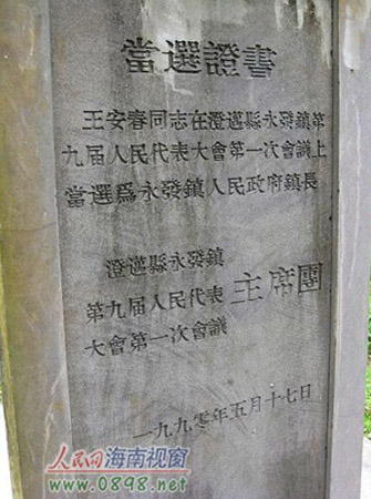 在儒友村,記者看到通到村外的村公路還沒(méi)修好。公路旁,一座墳?zāi)狗浅T搜矍颉S浾呖吹竭@座活人墓修造很好,墳?zāi)沽⒂袃蓧K墓碑,墓碑上面有詳細(xì)的“簡(jiǎn)介”:王安春,1935生,共產(chǎn)黨員。1973年-1992年,歷任澄邁永發(fā)鎮(zhèn)副鎮(zhèn)長(zhǎng)、副書(shū)記、鎮(zhèn)長(zhǎng)。1992年3月-1996年10月,任澄邁縣農(nóng)業(yè)局副局長(zhǎng)。1996年11月從澄邁縣農(nóng)業(yè)局退休。工作期間,表現(xiàn)突出,被評(píng)為先進(jìn)黨員、先進(jìn)工作者,是鎮(zhèn)人大代表。