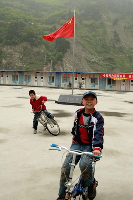 一間板房的山墻上掛著黑板,粉筆寫的“領(lǐng)取傷亡補助的通知”已經(jīng)被雨水沖刷得模糊了!鞍宸砍鲎狻钡男V告和“自救飯店”“家庭旅店”的招牌隨處可見。映秀小學(xué)鑲嵌在居民區(qū)里,大門上的中國結(jié)、紅燈籠和院子中央鮮艷的紅旗十分醒目。