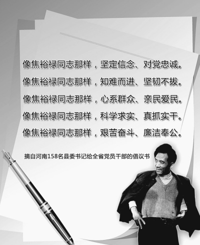 在“縣委書(shū)記的好榜樣”焦裕祿同志逝世45周年之際,河南158名縣(市、區(qū))委書(shū)記聯(lián)名發(fā)出倡議,要像焦裕祿同志那樣,心系群眾、親民愛(ài)民,艱苦奮斗、無(wú)私奉獻(xiàn),堅(jiān)持以廉為重、正派做人,不為名利所困、不為物欲所誘、不為人情所擾,真正做到權(quán)為民所用、情為民所系、利為民所謀,爭(zhēng)做焦裕祿式好干部,爭(zhēng)創(chuàng)焦裕祿式業(yè)績(jī)。