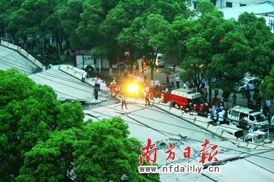 當時,數(shù)聲巨響鉆進株洲市民李先生的耳朵。辦公室的同事隨即放下手中的工作,擠在窗口急切地想看下面發(fā)生了什么。一位女同事指向紅旗廣場的方向,用驚恐的聲音告訴他們“垮橋了”。李先生放眼望去,垮橋的地點,距離他辦公室不過數(shù)百米的紅旗廣場附近。