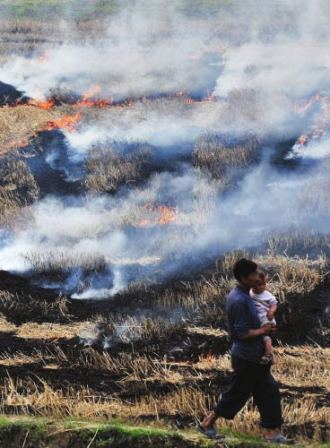 繼續(xù)往北行駛,在前方大約一公里處,一位農(nóng)夫正將一大堆秸稈點(diǎn)燃,燒秸稈的火苗足有半米多高,騰起的濃煙讓高速路上的車(chē)輛都放慢了速度。在點(diǎn)燃一堆秸稈后,這名農(nóng)夫又轉(zhuǎn)身到另一塊農(nóng)田里,點(diǎn)燃堆放在那兒的秸稈……