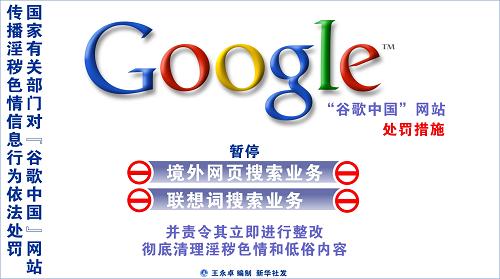 全國整治互聯(lián)網(wǎng)低俗之風辦公室19日向媒體透露,國家有關(guān)部門已經(jīng)召見“谷歌中國”網(wǎng)站負責人,對該網(wǎng)站大量傳播淫穢色情內(nèi)容進行執(zhí)法談話,宣布暫停該網(wǎng)站境外網(wǎng)頁搜索業(yè)務(wù)和聯(lián)想詞搜索業(yè)務(wù),并責令其立即進行整改,徹底清理淫穢色情和低俗內(nèi)容。