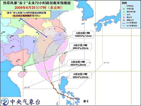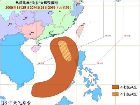 預(yù)計(jì),風(fēng)暴中心將以每小時(shí)15-20公里的速度向西北方向移動(dòng),以后將轉(zhuǎn)向偏北方向移動(dòng),逐漸向廣東中部到福建南部一帶沿?拷,強(qiáng)度有所加強(qiáng),并有可能于明天夜間到后天白天在這一帶沿海登陸。受“浪卡”和西南季風(fēng)的共同影響,今天晚上到明天白天,南海東部和南部海面將有6-8級(jí)大風(fēng),“浪卡”中心經(jīng)過的附近海面的風(fēng)力可達(dá)9-10級(jí)。