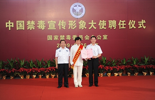 國(guó)家禁毒委員會(huì)辦公室常務(wù)副主任、公安部禁毒局局長(zhǎng)楊鳳瑞為中國(guó)禁毒宣傳形象大使成龍頒發(fā)聘書并佩戴綬帶。