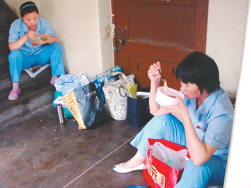 兩名護工在醫(yī)院走廊里解決晚餐。護工24小時陪在病人身邊,每天中午和傍晚兩個時段,分別可以抽出40分鐘解決吃飯問題,只有這一刻,是屬于他們自己的時間。