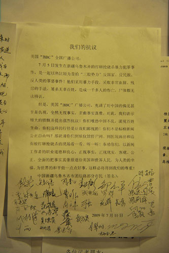7月13日上午,當(dāng)記者來(lái)到設(shè)在烏魯木齊海德飯店的新聞中心時(shí),這里的工作人員反映說(shuō),連日來(lái)他們不斷接到當(dāng)?shù)厥忻翊騺?lái)的電話,反映西方媒體關(guān)于“7·5”事件的報(bào)道不但有失公充,而且無(wú)視基本事實(shí),他們要求工作人員將他們的不滿和抗議轉(zhuǎn)告給相關(guān)的西方媒體記者。有些市民是直接將他們抗議信送到新聞中心,將其貼在那里。